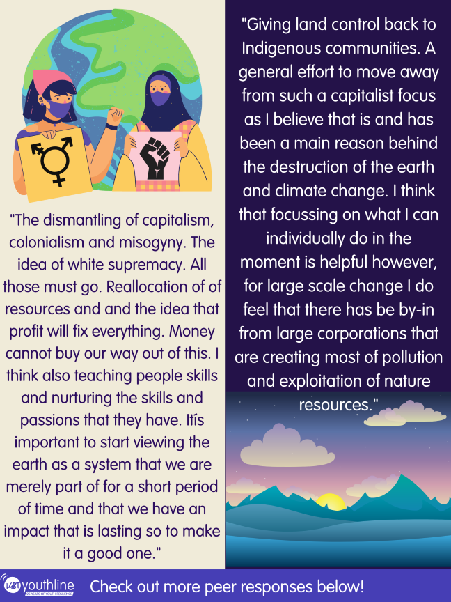In December 2021, a staff member at YouthLine created a survey about climate despair for other staff and volunteers, to find out what 2SLGBTQ+ youth are thinking and feeling about climate despair and climate change. A few questions asked in that survey were similar to the self-reflection questions asked above. Here are the questions from the survey, and answers from peers!