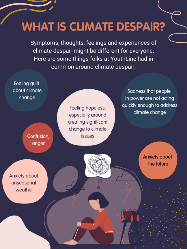 Here at YouthLine, staff started to prioritize talking about their thoughts, experiences, and feelings in regard to climate change once we realized how many of us were feeling anxiety about the earth. The term “climate despair” came up, so we wanted to unpack that a little bit, and offer some resources in case climate despair is something that’s been on your mind, or something you’ve been experiencing.